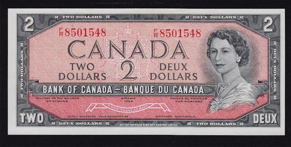 1954 Bank of Canada $2 Charlton Plate Note - BC-38, Photo used in Charlton catalogue, missing signatures, very rare. S/N:F/R8501548.
