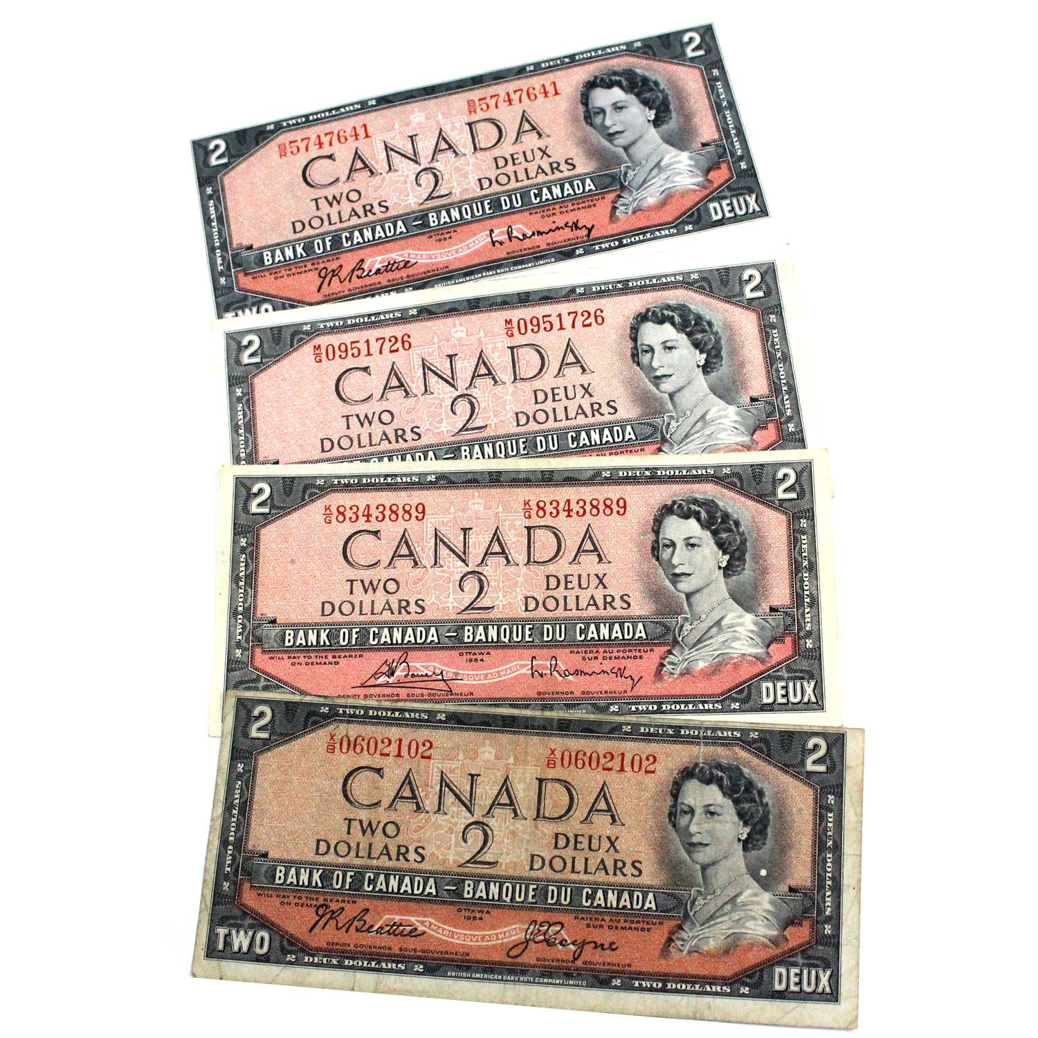 1954 Bank of Canada $2 Modified Portrait Notes Featuring All Signature Combinations - Beattie-Coyne, Bouey-Rasminsky, Lawson-Bouey & Beattie-Rasminsky. 4pcs