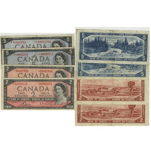 4 asterisk replacement notes; average circulated very light soiling and a couple of minor nicks. $2*A/G0363315; $2*K/G0387842; $5*R/C0096212; and $5*R/X0332783, no return.