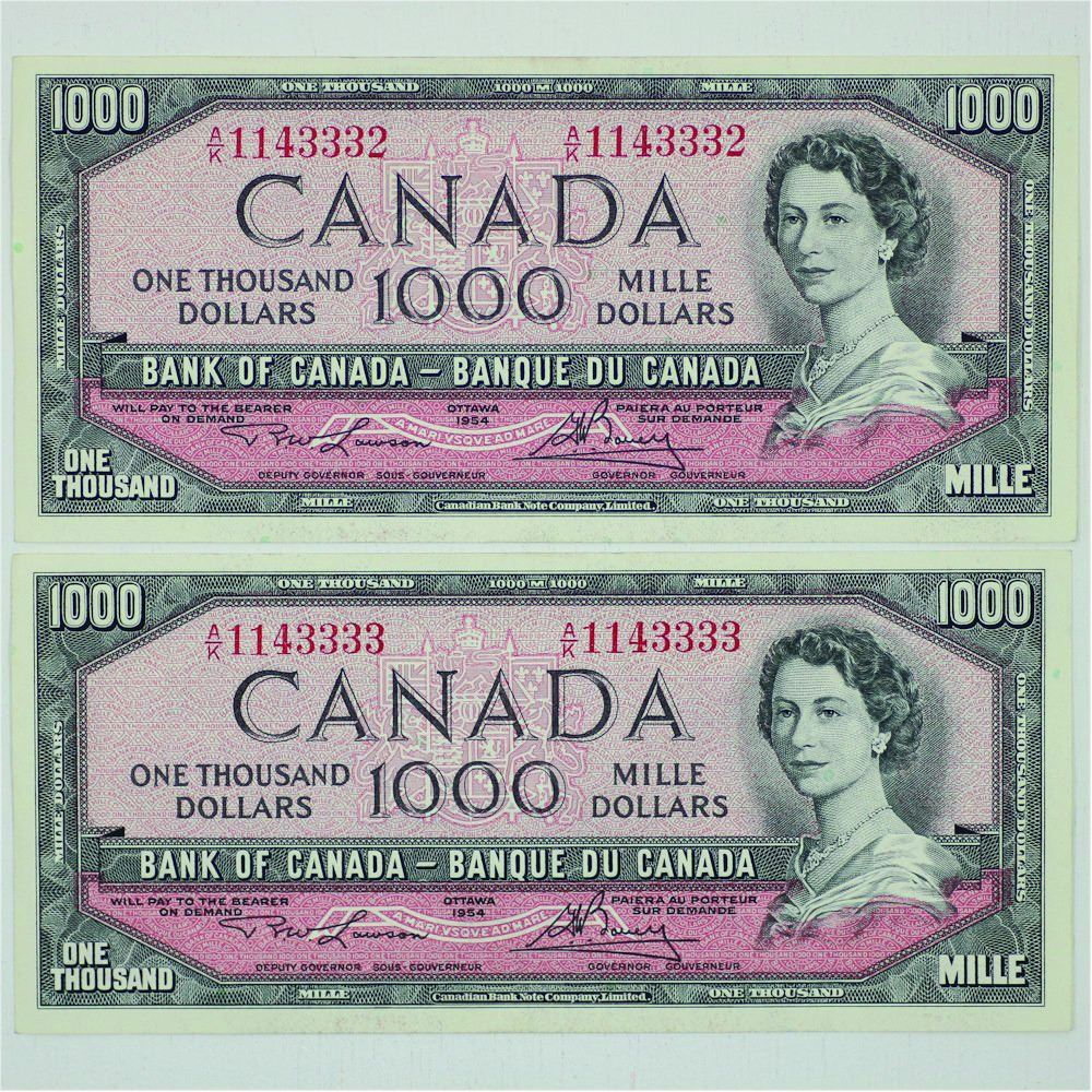 1954 Bank of Canada 2 x $1000 Notes BC-44d Lawson-Bouey with consecutive serial numbers in Uncirculated +. 2pcs