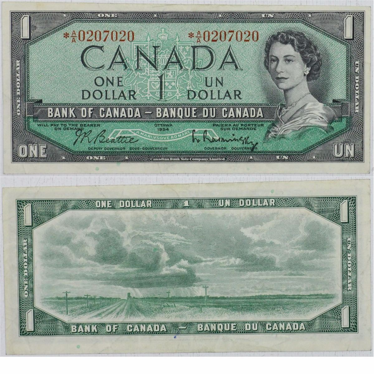 1954 Bank of Canada 3 digit RADAR $1; cat code BC-37bA, *A/A0207020
