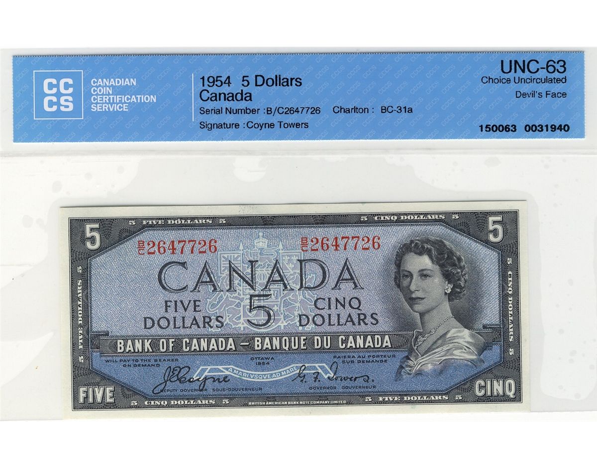 1954 Bank of Canada; $5 BC-31a #BC2647726 CCCS UNC63.