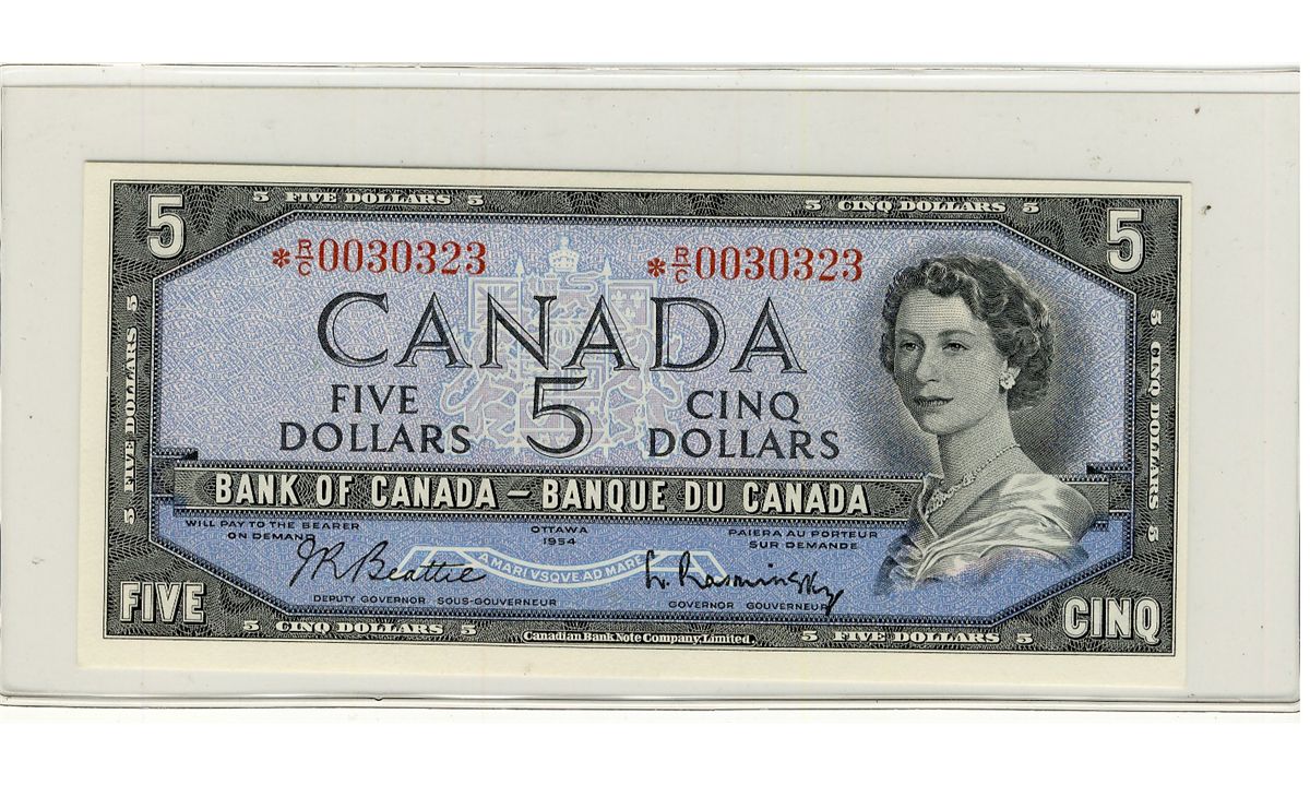 1954 Bank of Canada $5 BC-39bA #*RC0030323, crisp AU /UNC issue.