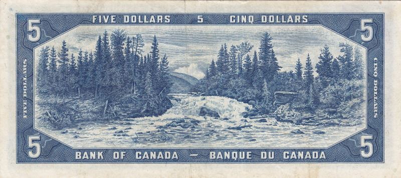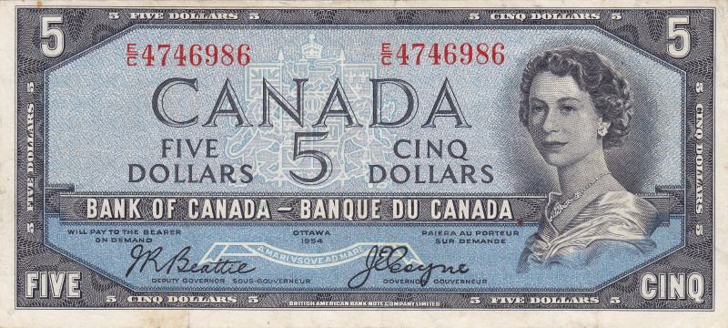 1954 Bank of Canada $5 Bank Note - Devil's Face Portrait - E/C Series, Beattie / Coyne Signatures - EF Condition