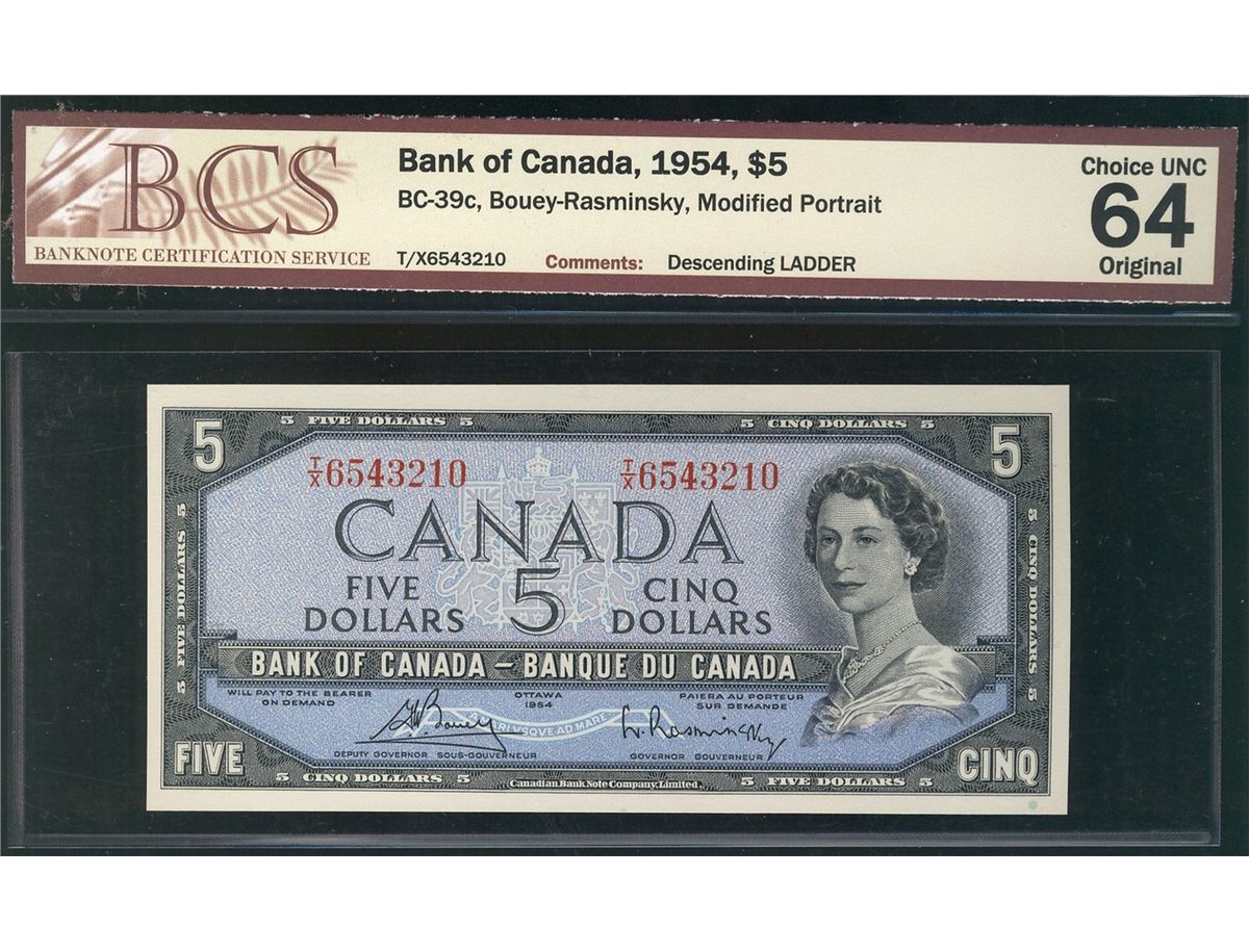 1954 Bank of Canada; 5 Dollars #TX6543210, BCS CH UNC-64; Ladder Serial number.
