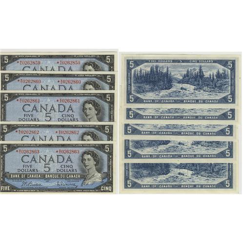 Scarce! 5 sequential asterisk replacement notes, crisp unc with counting crease and slight improper storage. Serial #'s *W/S0262859 - *W/S0262863, Beattie-Rasminsky. BC-39bA, no return.
