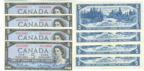 Queen Elizabeth issue, 4 miscellaneous very fresh crisp unc. Nicely centered, each Beattie-Rasminsky signature and I/S prefix. Serial #'s 5123009, 6314597, 6357318 and 9145098, BC-39b (no return).