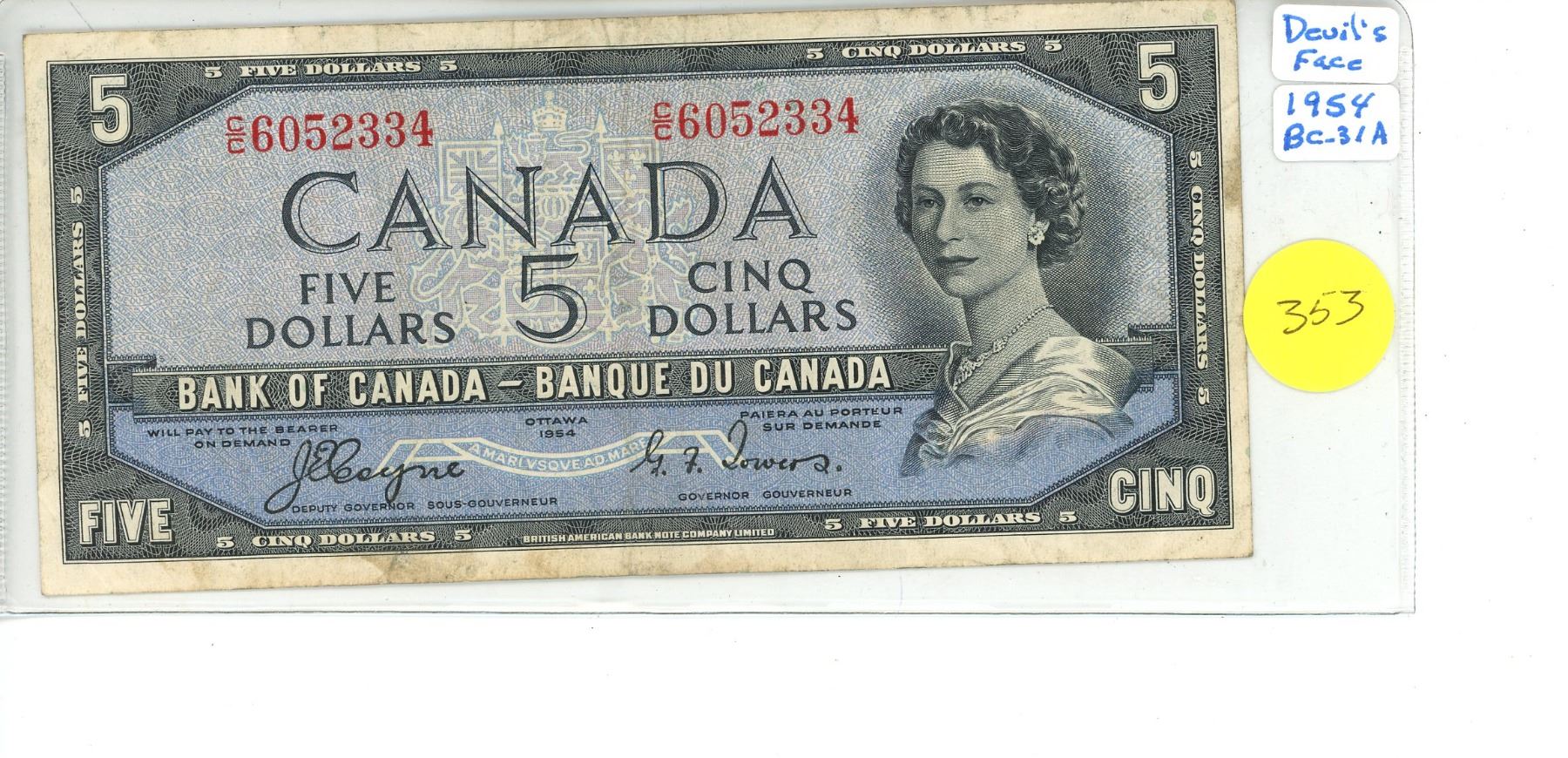1954 Bank of Canada Five Dollar Note "DEVIL'S FACE"