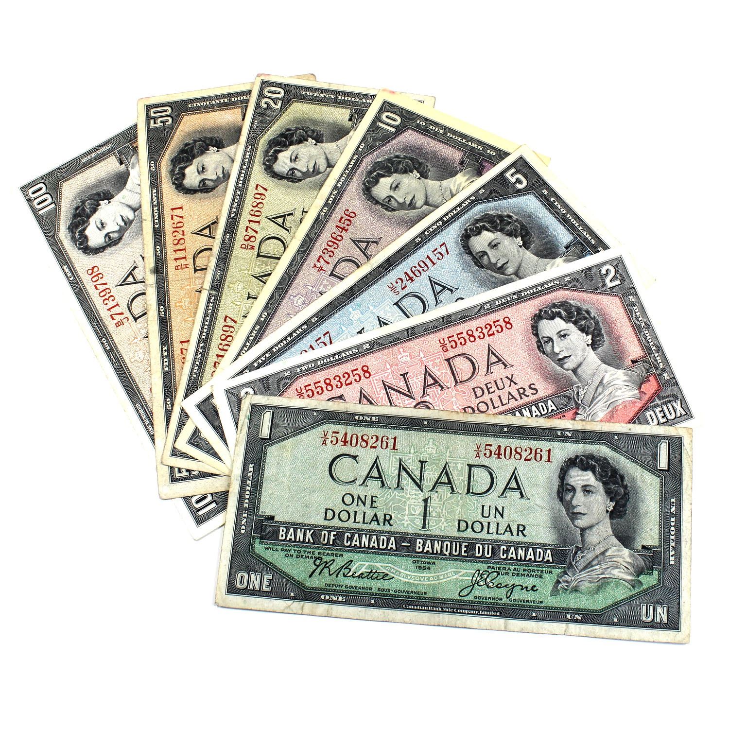 1954 Bank of Canada Modified Portrait $1 Through $100 Full Denomination Run. 7pcs