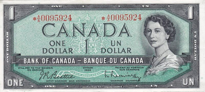 1954 Bank of Canada Replacement $1 Bank Note - Modified Portrait - *AA Series - Beattie / Rasminsky - AU Condition
