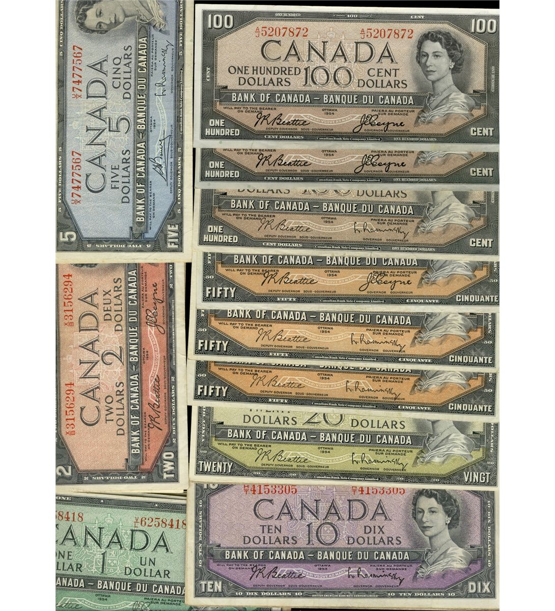1954 Banknote Lot; includes Modified issues $1(10), $(7), $5(2), $10(5), $20(10), $50(3) & $100(3).