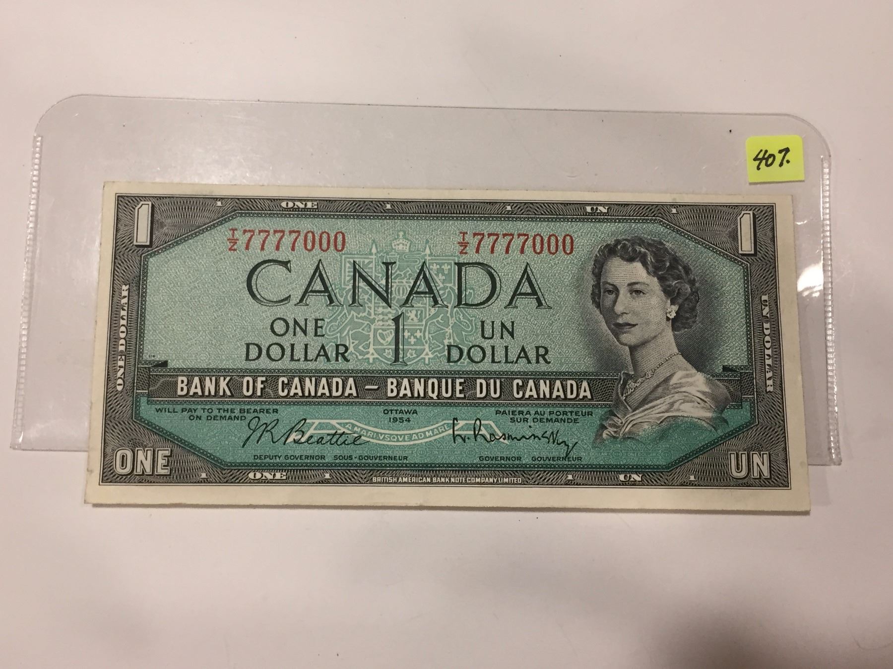 1954 Bk of Canad One Dollar Bill; SN T/Z 7777000