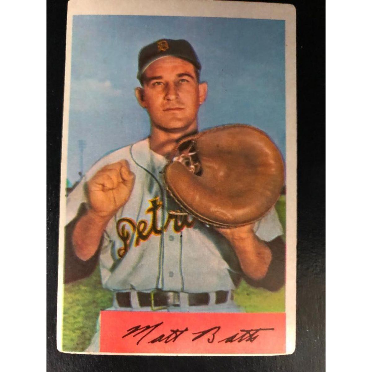 A 1954 Bowman #183 Matt Batts Baseball Card. Great Autograph Facsimile Catcher Card From The 1950's. View Photos For Further Details.
