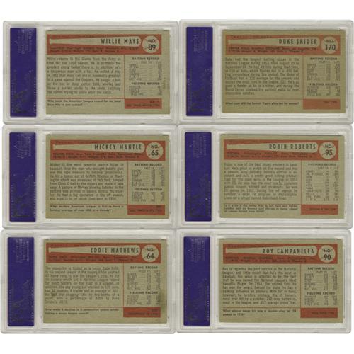 <B>1954 Bowman Baseball Complete Set (224).</B></I> Bowman's 1954 release boasts 224 full-color cards. Contractual problems most likely caused the pulling of card #66 (Ted Williams) from the set, creating one of the true rarities of the postwar era. The offered set includes both the #66 and #210 Jim Piersall, while omitting the tough #66 Ted Williams card. A total of six cards have been graded by PSA with an aggregate SMR value of $697. Graded cards - <B>PSA 7:</B></I> #95 Roberts; <B>PSA 6:</B></I> #64 Mathews; 89 Mays (OC), 90 Campanella, 170 Snider; <B>PSA 4:>Q #65 Mantle. Ungraded cards include #1 Rizzuto (EX), 6 Fox (VG/EX), 15 Ashburn (EX), 45 Kiner (G/VG), 58 Reese (VG/EX), 62 Slaughter (VG/EX), 101 Larsen (EX/MT), 132 Feller (EX), 138 Hodges (EX), 145 Martin (VG/EX), 161 Berra (VG/EX), 164 Wynn (EX), 177 Ford (VG/EX). Grades 74% EX to EX/MT, 26% VG to VG/EX.