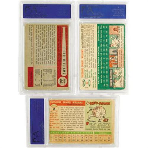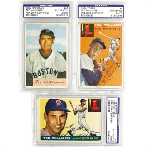 <B>1954-55 Ted Williams Signed Trading Cards Lot of 3.</B></I> Trio of vintage cardboard offers a look at the returning Korean War hero. Each is signed by Williams in 9/10 blue ballpoint, with the 1954 Topps card bearing the signature of fellow Red Sox legend Tris Speaker as well. Cards featured: 1954 Bowman #66, 1954 Topps #1, 1955 Topps #2. While the cards technically grade Good to VG, each presents very nicely regardless. Each card is encapsulated by PSA/DNA as "Authentic" for protection and unquestioned authenticity.<BR><BR><b>Shipping:</b> Sportscard (<a target="_blank" href="http://www.heritageauctions.com/common/shipping.php">view shipping information</a>)