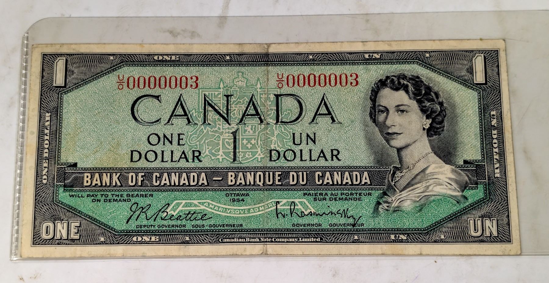 1954 CANADA $1 BANKNOTE SINGLE DIGIT SERIAL #