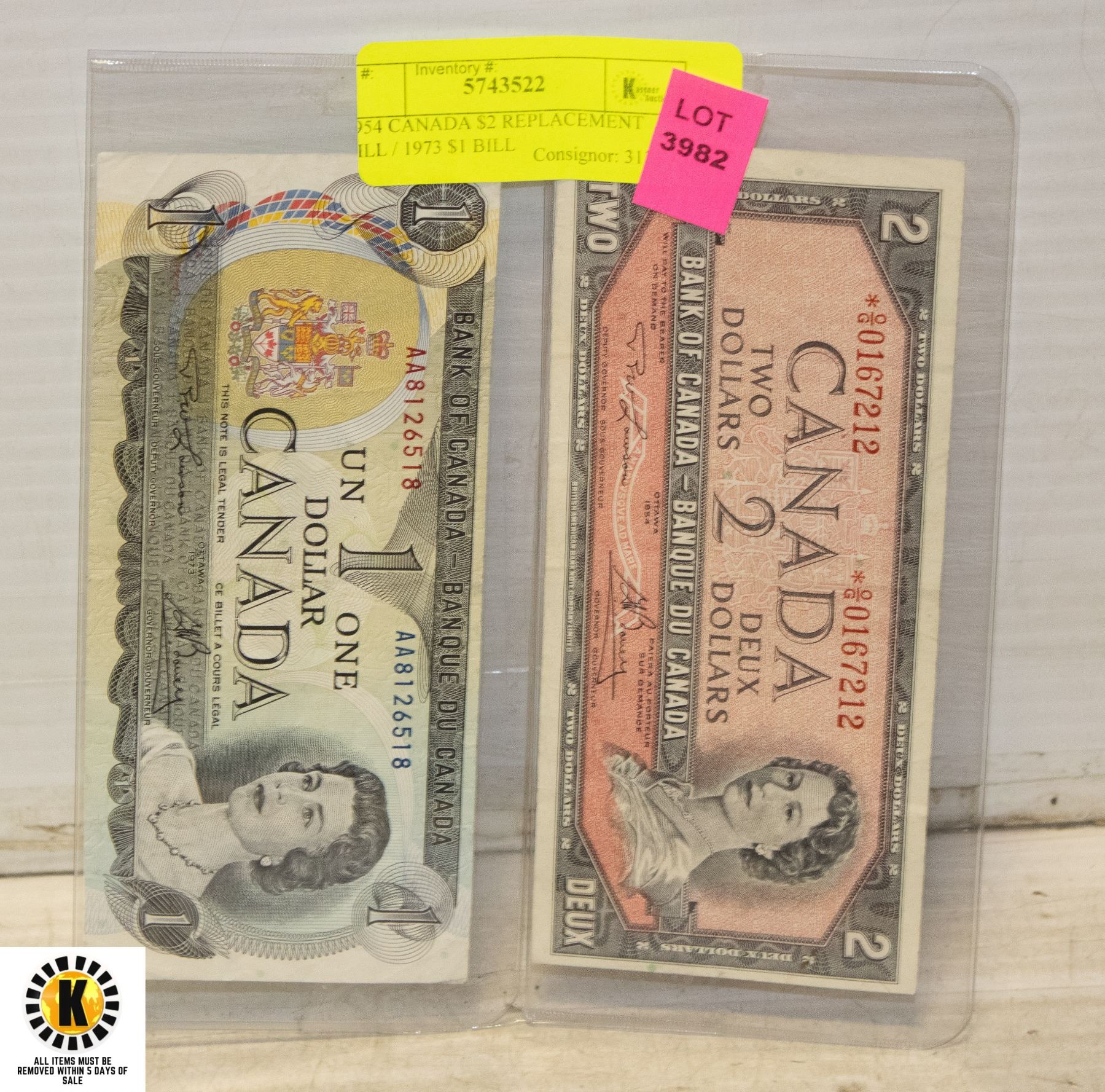 1954 CANADA $2 REPLACEMENT BILL / 1973 $1 BILL