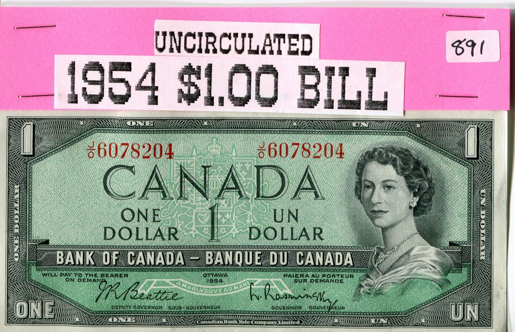 1954 CANADIAN $1.00 BANK NOTE UNCIRCULATED