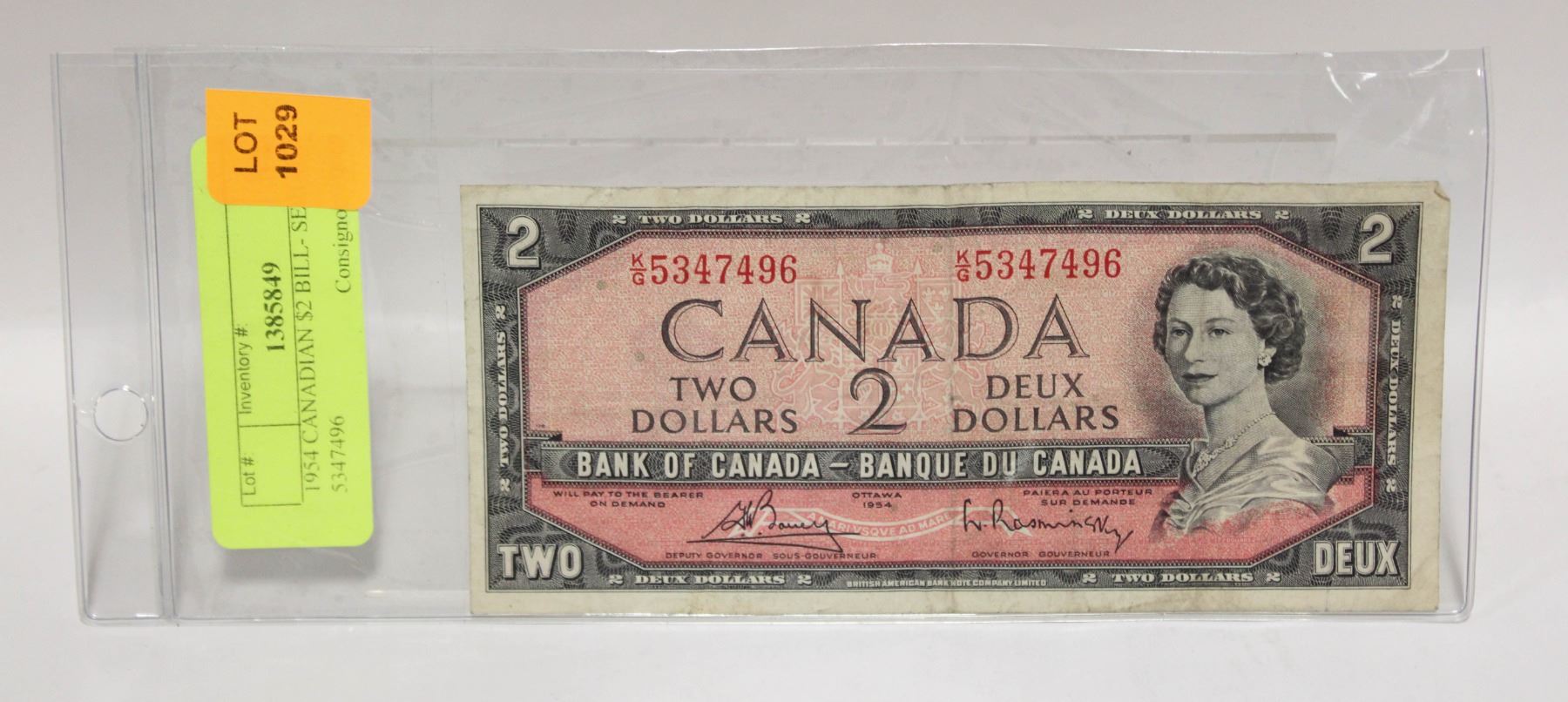 1954 CANADIAN $2 BILL- SERIAL # 5347496