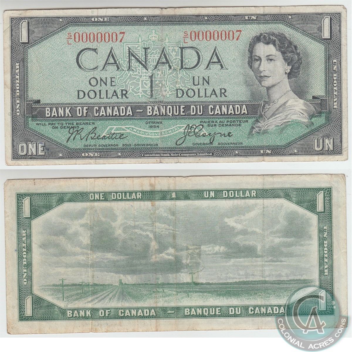 1954 Canada $1.00 note with very low serial number S/L0000007.