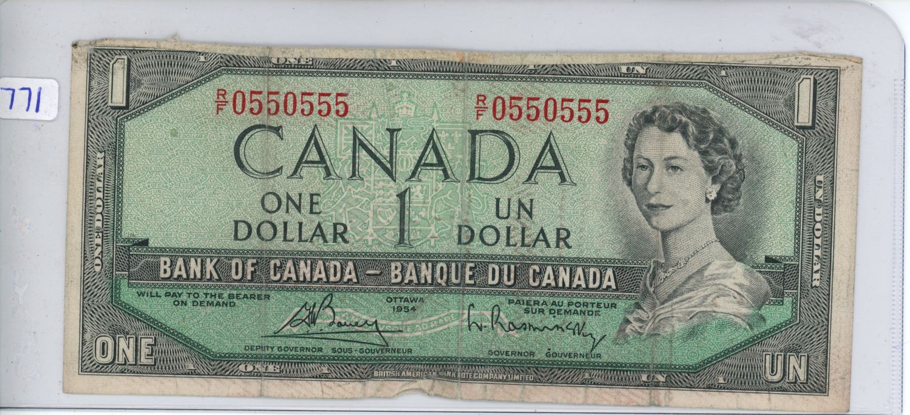 1954 Canada $1, Bouey/Rasminsky (#R/R 0550555) Fancy serial number