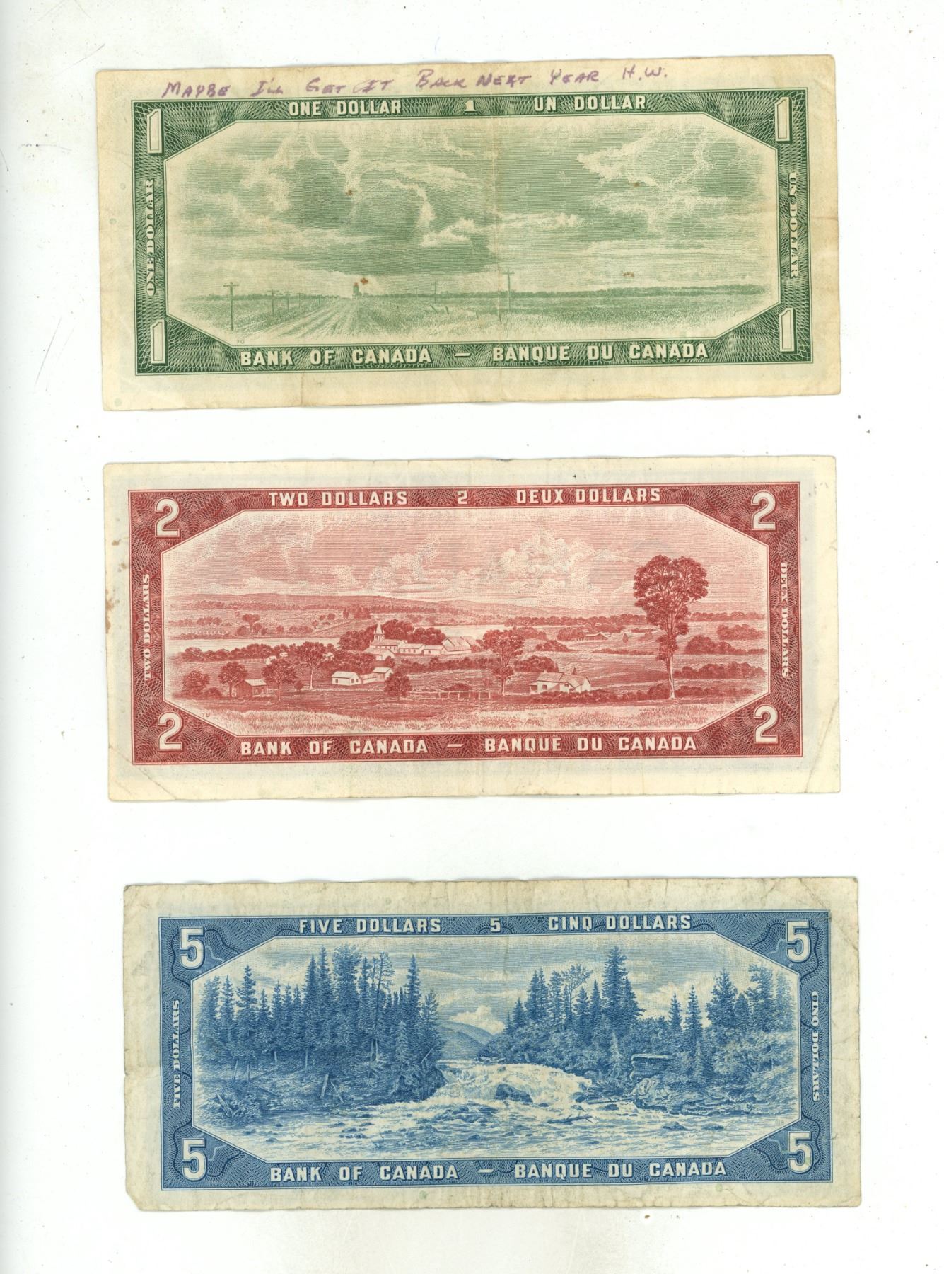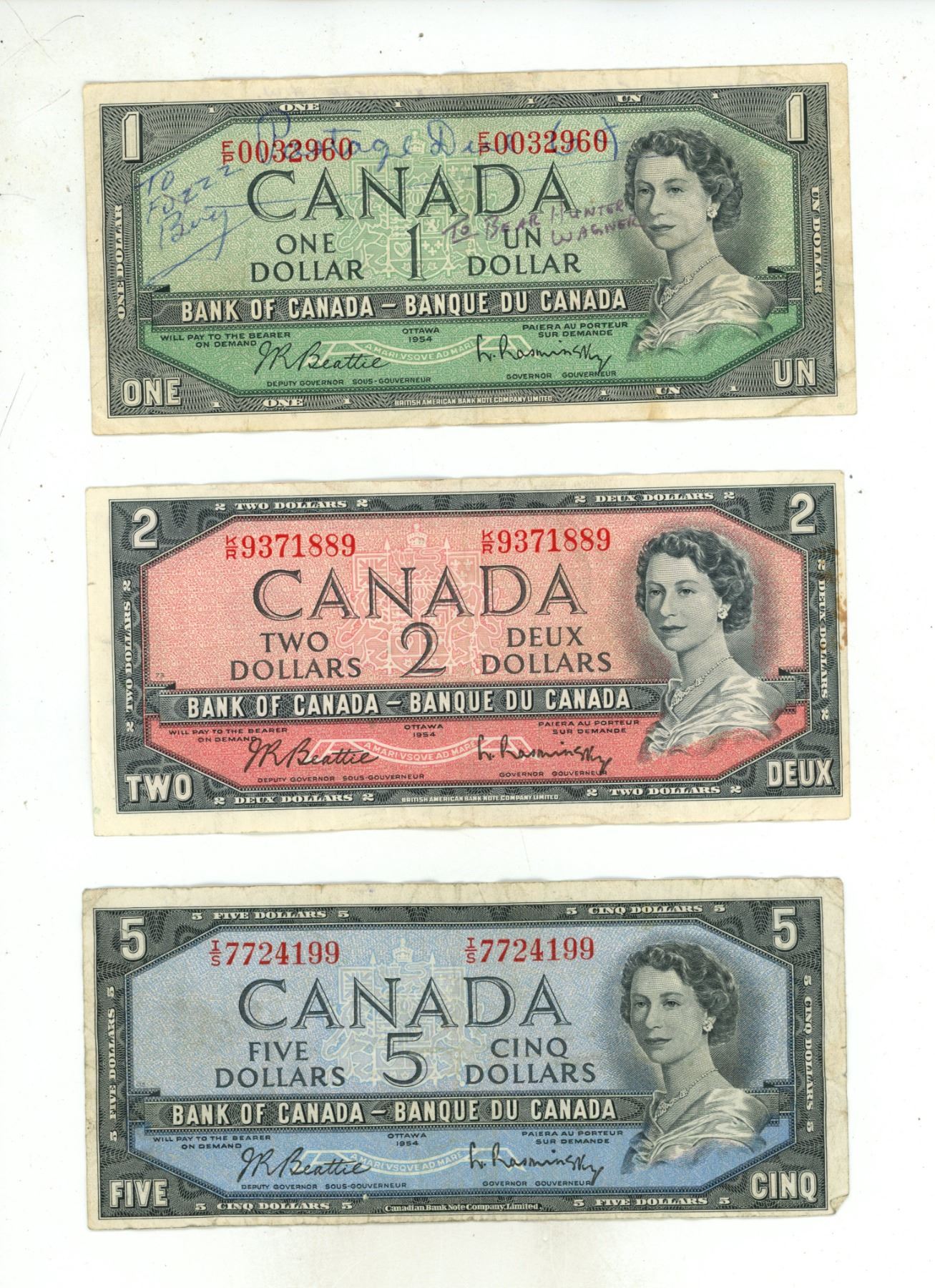 1954 Canada One, Two, and Five Dollar.