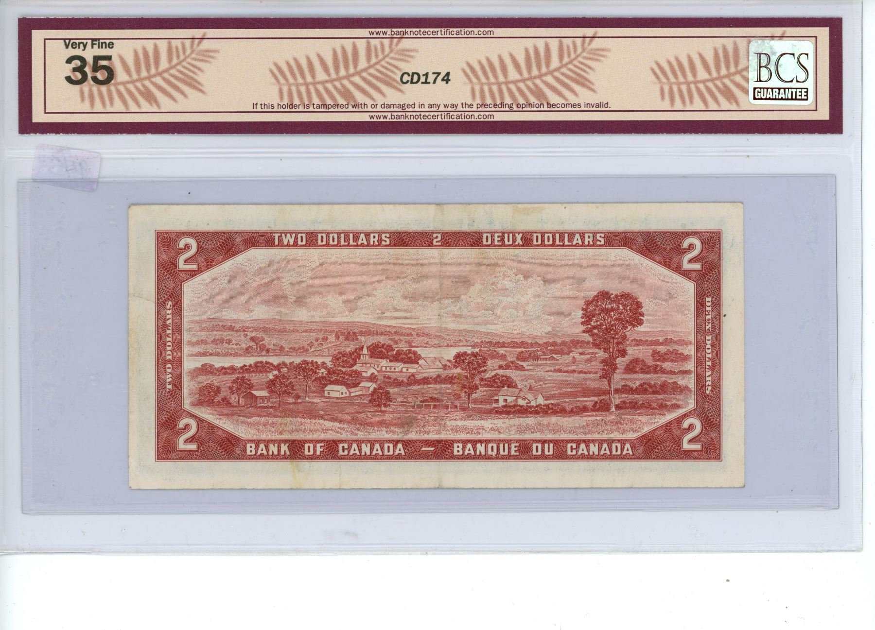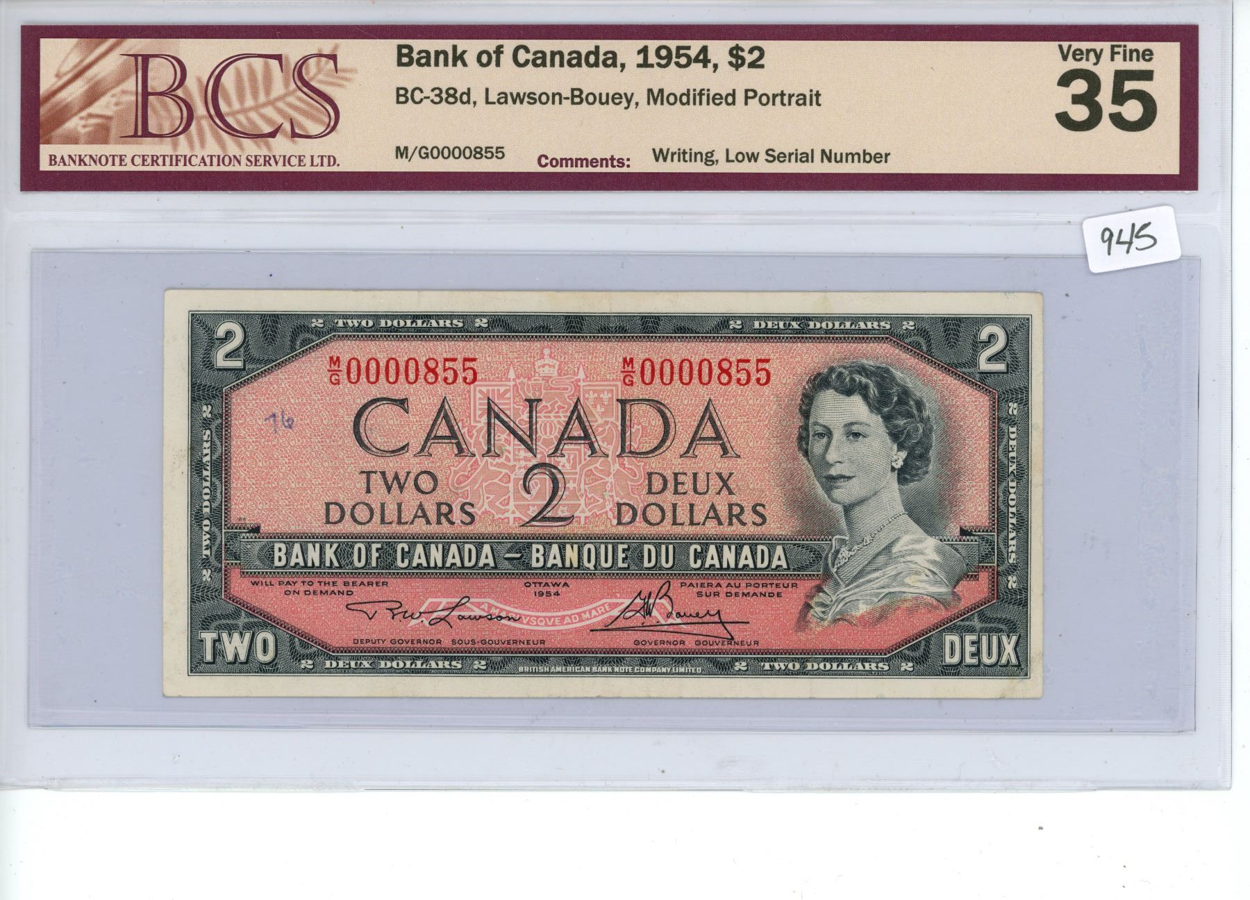 1954 Canadian $2 Bill - BCS Graded, Writing, Low Serial #, VF35
