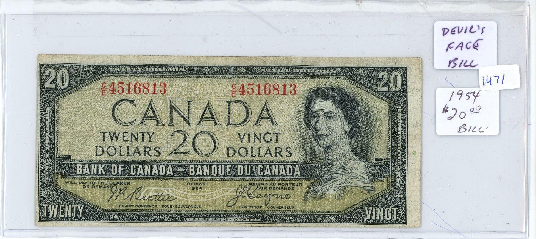 1954 Canadian 20 Dollar Bill, Beattie/Coyne, C/E4516813; Devil's Face Bill