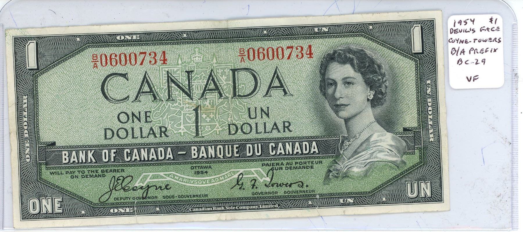 1954 Canadian Dollar Bill Devils Face Coyne-Tower