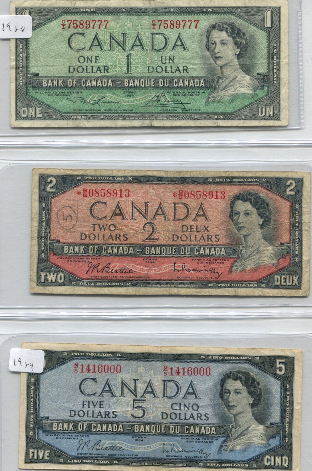 1954 Canadian One Dollar Bill + Two Dollar Bill + Five Dollar Bill