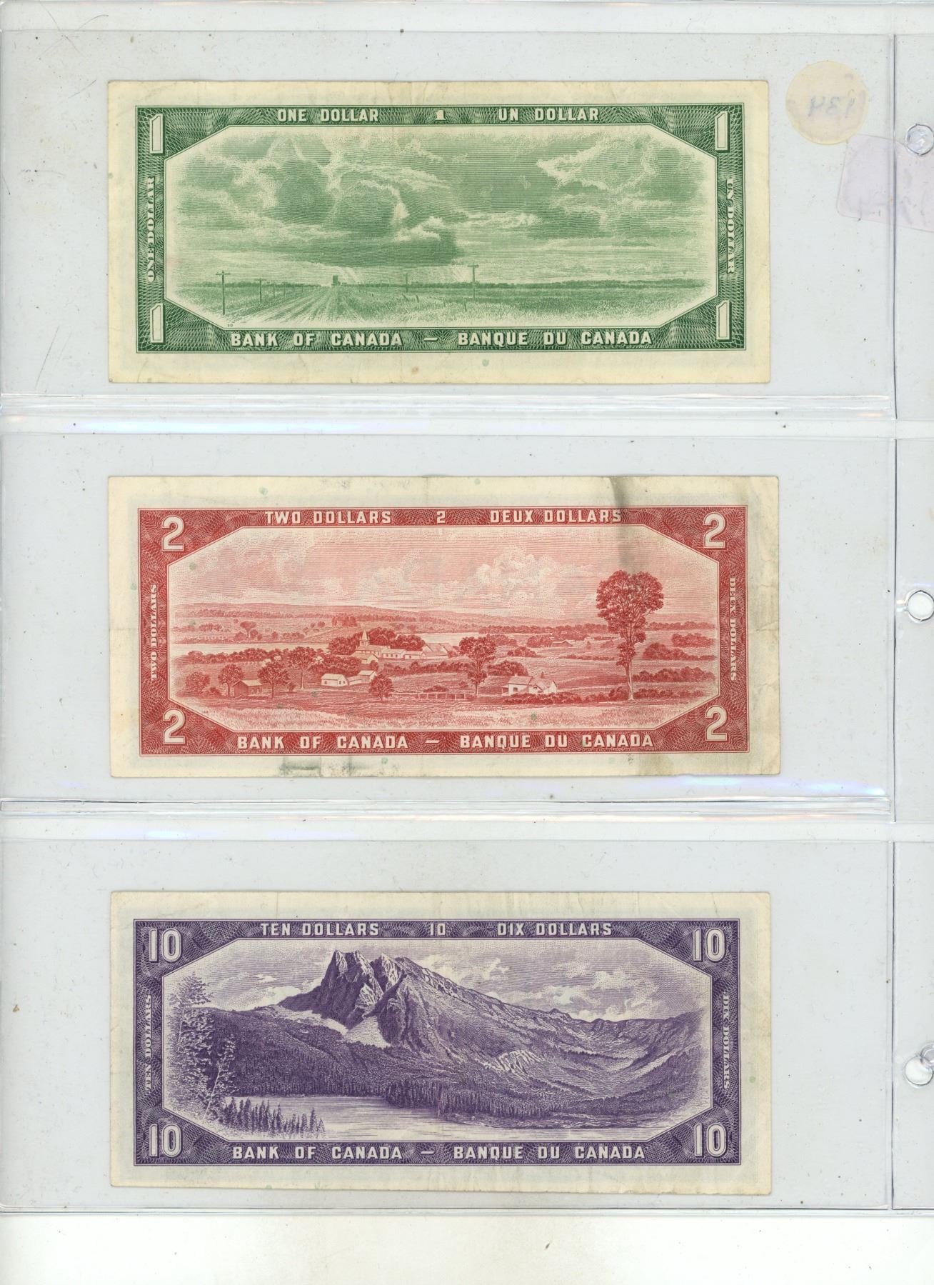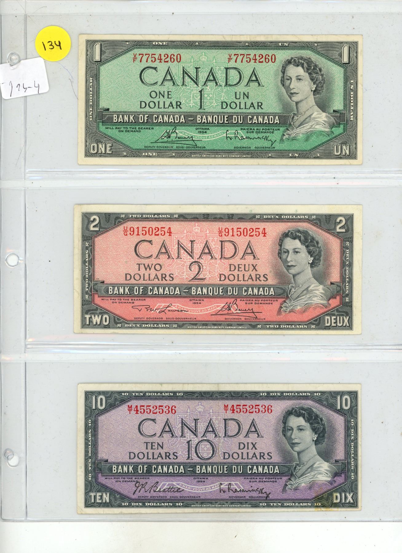 1954 Canadian One, Two, Ten Dollars.