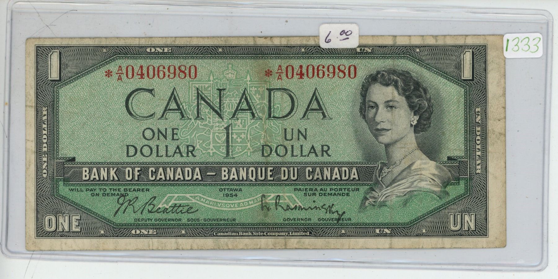 1954 Canadian replacement 1 dollar bill - Beattie/Rasminsky - *A/A 0406980