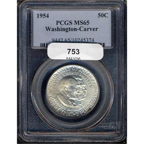 <b>1954 Carver-Washington Half Dollar. PCGS graded MS65.</b> Frosted glass luster underneath the silvery color and impressive fields. Something for the connoisseur of half dollar commemoratives <b>(PCGS # 9442)</b> <i>