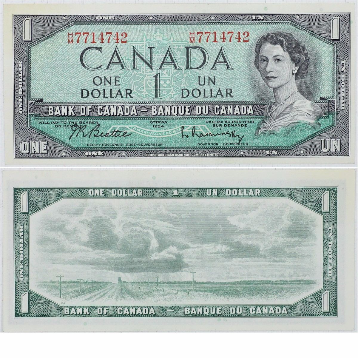 1954 Changeover $1.00 note from the Bank of Canada; cat code BC-37b-i, Beattie-Rasminsky signatures,