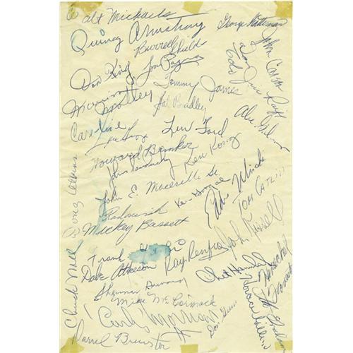 <B>1954 Cleveland Browns Team Signed Sheet.</B></I> As any knowledgeable football autograph collector will tell you, team signed sheets are tough, and all but nonexistent from the 1950's or earlier. So it's quite a thrill to find any of this era, much less one from an NFL Championship team. The squad that closed out a 9-3 record with a dismantling of the Detroit Lions in the Championship game by a score of 56-10 appears together on this 6" x 9" page in vintage ink. Over 40 blue ink autographs rank in the 9/10 range, except for five which are affected by water droplets that have made the ink bleed. Hardest hit, sadly, is Hall of Famer Frank Gatski, though the others affected are lesser players, leaving fellow Cantonites Len Ford (very rare!), Mike McCormick, Otto Graham, Marion Motley and Chuck Noll in tip-top shape. Missing are the great Coach Brown and Dante Lavelli, though the latter could still be had by an enterprising autograph hunter. Tape at the corners touches four autographs, with the final two letters of Graham's signature unobtrusively crossed. The page otherwise shows mild wrinkling that does very little to detract. Not a Mint specimen, but very strong, and terrifically rare. <I>LOA from PSA/DNA.</B></I> <BR><BR><B>Important notice:</B> Heritage usually auctions material at the rate of 200-250 lots per hour. On some occasions eBay Live bid software or the Internet may not be able to keep up with the pace of the auction. We recommend placing a realistic absentee bid now as insurance to avoid disappointment. Occasionally the auctioneer may eliminate or reject an eBay Live bid, and the auctioneer may also reopen a lot after the close of the eBay live bidding (usually because we missed an audience bid), and may reject your bid even if it shows you as the winning bidder. By bidding via eBay Live, you agree that Heritage may award the lot to another bidder at its sole discretion under the circumstances described above or any other reasonable circumstances. Since eBay bids are not shown to us until we open the lot on the floor, we treat those bids just like floor bids. In most cases the floor responds before the eBay bid is presented to us, due to Internet lag time, so for consistency we have made it a policy that floor bids are always considered first over tie eBay live bids. Also please note that all Heritage lots purchased through eBay Live carry a 22.5% Buyer's Premium. Please make sure you read the Terms and Conditions before you bid. This lot is being auctioned in conjunction with a live floor auction by Heritage Galleries & Auctioneers. All final auction and invoice information will be supplied by Heritage Galleries & Auctioneers, and all other information should be considered preliminary. Lot:19292 <BR><BR><B>Winning Notification and Billing:</B> After the FINAL session in this auction is complete, Heritage will send e-mail and snail mail invoices. This process normally takes several days. All final auction and invoice information will be supplied by Heritage Galleries & Auctioneers, and all other information should be considered preliminary. <BR><BR>This auction will be conducted on a live auction floor and over the Internet through eBay Live. If you choose to place an absentee bid, please take a moment to <font color='#0000ff'><u><a href='http://pages.ebay.com/liveauctions/help/before/laabsentee.html'>learn how eBay Live absentee bidding works</a></u></font><font color='#000000'>