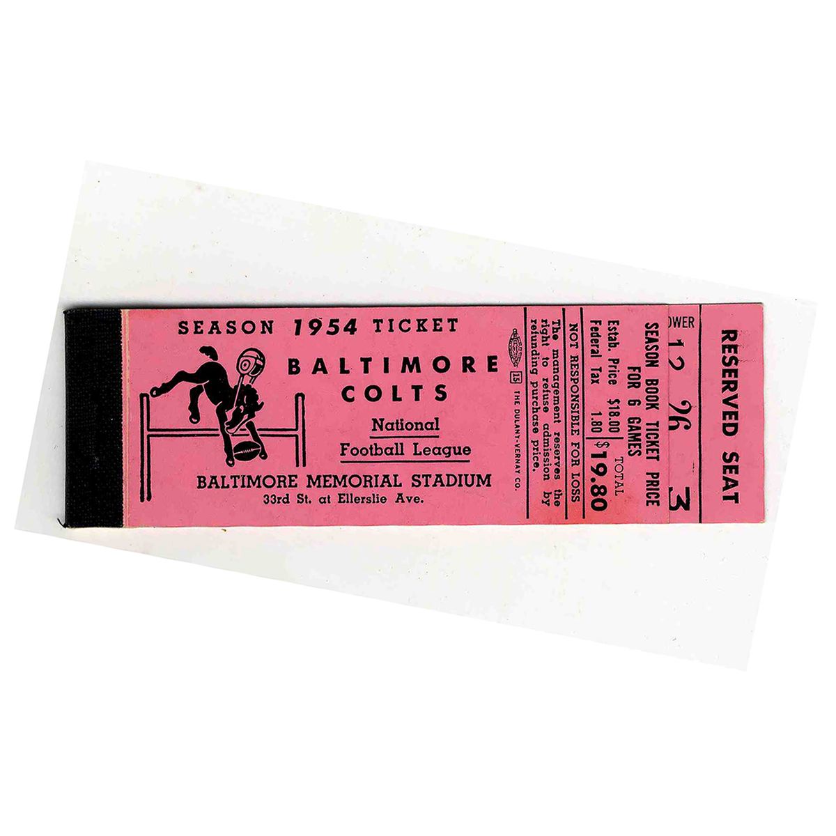 1954 Baltimore Colts Season Ticket Book -- All Tickets For Lower Section Reserved Seats Removed -- 5.5'' x 1.75'' -- Fine Condition