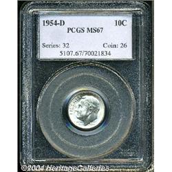 <B>1954-D<10C> MS67 PCGS.</B></I> A few touches of faint gold color rest upon lustrous surfaces that are devoid of any major abrasions. Population: 27 in 67, 0 finer (9/04). <BR><BR><B>Important notice:</B> Heritage usually auctions material at the rate of 200-250 lots per hour. On some occasions eBay Live bid software or the Internet may not be able to keep up with the pace of the auction. We recommend placing a realistic absentee bid now as insurance to avoid disappointment. Occasionally the auctioneer may eliminate or reject an eBay Live bid, and the auctioneer may also reopen a lot after the close of the eBay live bidding (usually because we missed an audience bid), and may reject your bid even if it shows you as the winning bidder. By bidding via eBay Live, you agree that Heritage may award the lot to another bidder at its sole discretion under the circumstances described above or any other reasonable circumstances. Since eBay bids are not shown to us until we open the lot on the floor, we treat those bids just like floor bids. In most cases the floor responds before the eBay bid is presented to us, due to Internet lag time, so for consistency we have made it a policy that floor bids are always considered first over tie eBay live bids. Also please note that all Heritage lots purchased through eBay Live carry a 20% Buyer's Premium. Please make sure you read the Terms and Conditions before you bid.