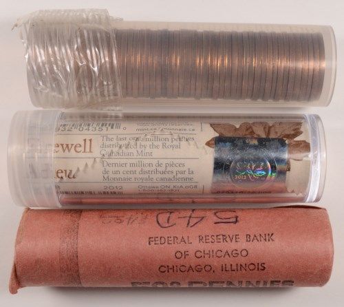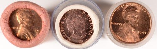 1954-D, 1944, BU LINCOLN ONE CENT ROLLS WITH 2012 CANADA BU ONE CENT ROLL
