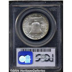 <B>1954-D<50C> MS65 Full Bell Lines PCGS.</B></I> Showing several abrasions on Franklin's cheek, this Gem sparkles with original luster and shows a tan-gold coloration around much of the peripheries. <BR><BR><B>Important notice:</B> Heritage usually auctions material at the rate of 200-250 lots per hour. On some occasions eBay Live bid software or the Internet may not be able to keep up with the pace of the auction. We recommend placing a realistic absentee bid now as insurance to avoid disappointment. Occasionally the auctioneer may eliminate or reject an eBay Live bid, and the auctioneer may also reopen a lot after the close of the eBay live bidding (usually because we missed an audience bid), and may reject your bid even if it shows you as the winning bidder. By bidding via eBay Live, you agree that Heritage may award the lot to another bidder at its sole discretion under the circumstances described above or any other reasonable circumstances. Since eBay bids are not shown to us until we open the lot on the floor, we treat those bids just like floor bids. In most cases the floor responds before the eBay bid is presented to us, due to Internet lag time, so for consistency we have made it a policy that floor bids are always considered first over tie eBay live bids. Also please note that all Heritage lots purchased through eBay Live carry a 20% Buyer's Premium. Please make sure you read the Terms and Conditions before you bid. </span></font></tr></table></td></tr></table>