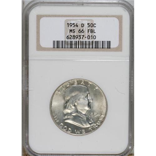 <B>1954-D 50C MS66 Full Bell Lines NGC.</B></I> Faint olive toning is seen over lustrous surfaces. Sharply struck, with well preserved surfaces that exhibit just a couple of wispy, well scattered marks. Census: 17 in 66 Full Bell Lines, 1 finer (4/07).<BR><BR><b>Shipping:</b> Coins & Currency (<a target="_blank" href="http://www.heritageauctions.com/common/shipping.php">view shipping information</a>)