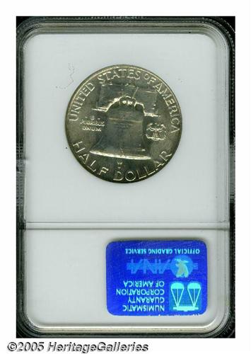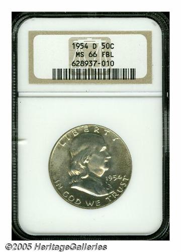 <B>1954-D<50C> MS66 Full Bell Lines NGC.</B></I> Faint olive toning is seen over lustrous surfaces. Sharply struck, with well preserved surfaces that exhibit just a couple of wispy, well scattered marks. Population: 16 in 66, 1 finer (5/05).