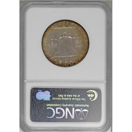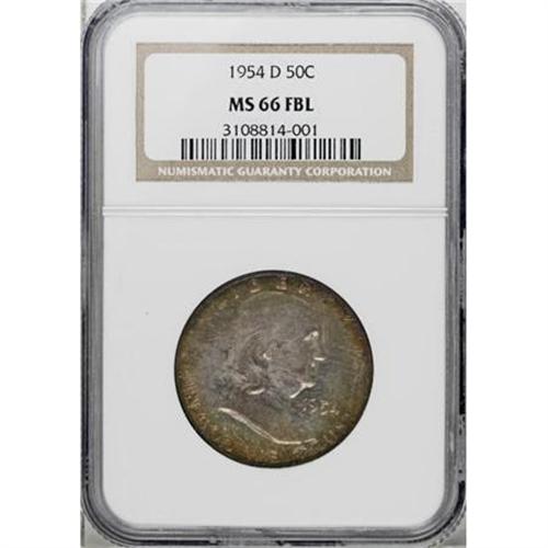 <B>1954-D 50C MS66 Full Bell Lines NGC.</B></I> An attractive piece with rich patina over each side. Silver-gray centers cede to golden-tan and rose at the rims. Though the overall detail shows indicators of this issue's usual softness, the bell lines are intact. Census: 18 in 66 Full Bell Lines, 1 finer (3/08).<BR><BR><b>Shipping:</b> Coins & Currency (<a target="_blank" href="http://www.heritageauctions.com/common/shipping.php">view shipping information</a>)