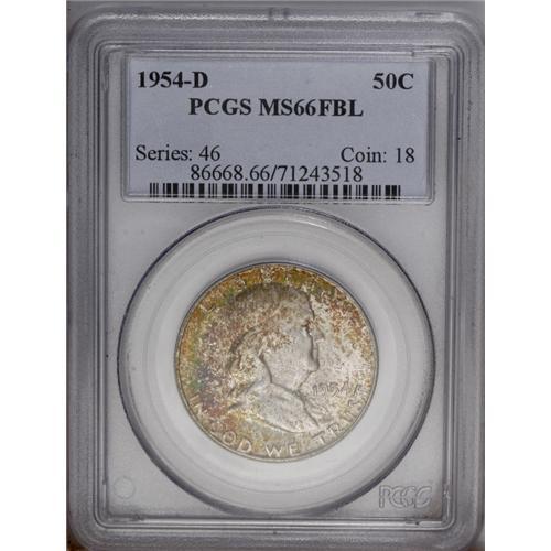 <B>1954-D 50C MS66 Full Bell Lines PCGS.</B></I> Freckled golden-red, magenta, and jade-green patina drifts over the obverse of this richly frosted Gem. The reverse is equally as smooth as the obverse with a blush of reddish-gold iridescence at the left border. Population: 70 in 66, 2 finer (1/06).
