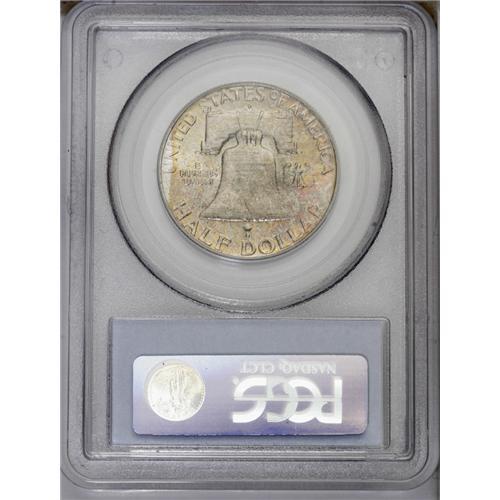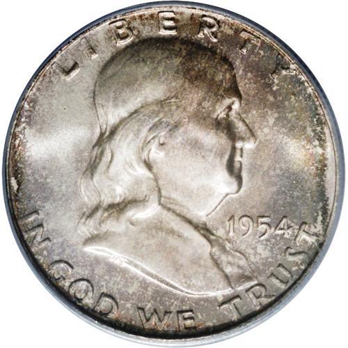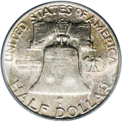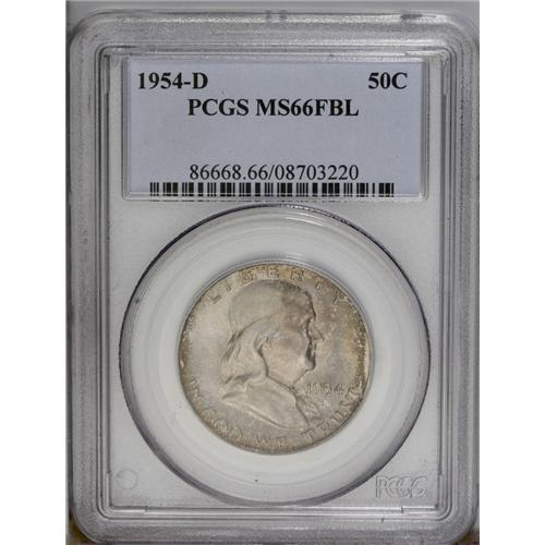 <B>1954-D<50C> MS66 Full Bell Lines PCGS.</B></I> This issue is extremely scarce in the MS66 Full Bell Lines level, as any Franklin devotee will attest. This lovely example has light gray-gold toning on the obverse, with deeper gold at the rims. The reverse offers yellow-gold, amber, and copper tones that deepen to fuchsia and jade-green at 4 o'clock. The toning is mellow and translucent rather than deep and opaque, so that considerable mint luster radiates from beneath. The bell lines are boldly executed, although a small nick through the upper lines bears mention. PCGS has graded only two examples of this elusive issue finer (3/06). <BR><BR><B>Important notice:</B> Heritage usually auctions material at the rate of 200-250 lots per hour. On some occasions eBay Live bid software or the Internet may not be able to keep up with the pace of the auction. We recommend placing a realistic absentee bid now as insurance to avoid disappointment. Occasionally the auctioneer may eliminate or reject an eBay Live bid, and the auctioneer may also reopen a lot after the close of the eBay live bidding (usually because we missed an audience bid), and may reject your bid even if it shows you as the winning bidder. By bidding via eBay Live, you agree that Heritage may award the lot to another bidder at its sole discretion under the circumstances described above or any other reasonable circumstances. Since eBay bids are not shown to us until we open the lot on the floor, we treat those bids just like floor bids. In most cases the floor responds before the eBay bid is presented to us, due to Internet lag time, so for consistency we have made it a policy that floor bids are always considered first over tie eBay live bids. Also please note that all Heritage lots purchased through eBay Live carry a 20% Buyer's Premium. Please make sure you read the Terms and Conditions before you bid. This lot is being auctioned in conjunction with a live floor auction by Heritage Galleries & Auctioneers. All final auction and invoice information will be supplied by Heritage Galleries & Auctioneers, and all other information should be considered preliminary. Lot:3105 <BR><BR><B>Winning Notification and Billing:</B> After the FINAL session in this auction is complete, Heritage will send e-mail and snail mail invoices. This process normally takes several days. All final auction and invoice information will be supplied by Heritage Galleries & Auctioneers, and all other information should be considered preliminary. <BR><BR>This auction will be conducted on a live auction floor and over the Internet through eBay Live. If you choose to place an absentee bid, please take a moment to <font color='#0000ff'><u><a href='http://pages.ebay.com/liveauctions/help/before/laabsentee.html'>learn how eBay Live absentee bidding works</a></u></font><font color='#000000'>