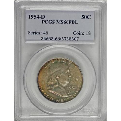<B>1954-D 50C MS66 Full Bell Lines PCGS.</B></I> A blend of rainbow toning and dappled olive-gray graces the obverse, while the reverse is mostly light gray. Highly lustrous, sharply struck, and well preserved. Population: 81 in 66 Full Bell Lines, 2 finer (8/07).<BR><BR><b>Shipping:</b> Coins & Currency (<a target="_blank" href="http://www.heritageauctions.com/common/shipping.php">view shipping information</a>)