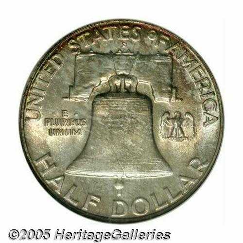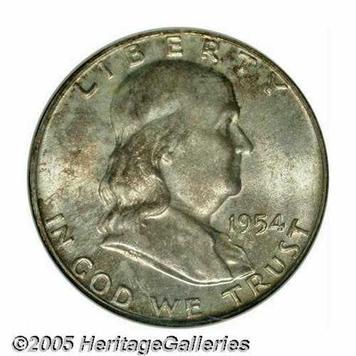 <B>1954-D<50C> MS67 Full Bell Lines NGC.</B></I> A memorable 1954-D Franklin and indeed one of the finest graded pieces certified by either NGC or PCGS. The surfaces are not only remarkably clean and blessed with intense, satiny luster, but have also taken on glorious pastel toning across both sides with a slightly deeper appearance on the obverse. We can say with near-certainty that here is a coin that will never require upgrading. Population: 1 in 67 FBL, none finer at either service (4/05).