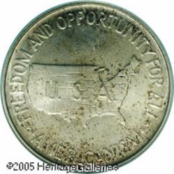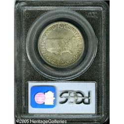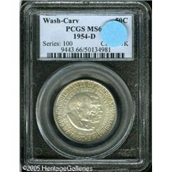 <B>1954-D 50C Washington-Carver MS66 PCGS.</B></I> This original looking Commem is free of an excessive number of abrasions, and those that are present are small and not individually conspicuous. More sharply struck than the typical example of this well known striking rarity, with nearly complete definition near the centers. There is a faint degree of mottled russet color near the obverse borders, while slightly more extensive mottling is present on the reverse. Fully lustrous. None have been graded any higher, by PCGS. Population: 6 in 66, 0 finer (1/05). Lot:8632