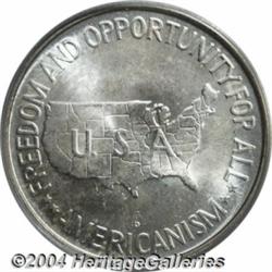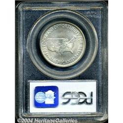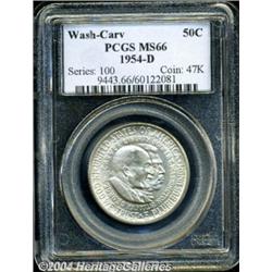 <B>1954-D<50C> Washington-Carver MS66 PCGS.</B></I> PCGS has certified only four examples of this commemorative production at the present grade level (3/04), a fact that confirms the importance of this lovely Gem among collectors who are assembling Registry Sets of U.S. Commemoratives. This is a satiny example whose seemingly abrasion-free surfaces are fully bright and completely untoned. Worth a close look and a premium bid. <BR><BR><B>Important notice:</B> Heritage usually auctions material at the rate of 200-250 lots per hour. On some occasions eBay Live bid software or the Internet may not be able to keep up with the pace of the auction. We recommend placing a realistic absentee bid now as insurance to avoid disappointment. Occasionally the auctioneer may eliminate or reject an eBay Live bid, and the auctioneer may also reopen a lot after the close of the eBay live bidding (usually because we missed an audience bid), and may reject your bid even if it shows you as the winning bidder. By bidding via eBay Live, you agree that Heritage may award the lot to another bidder at its sole discretion under the circumstances described above or any other reasonable circumstances. Since eBay bids are not shown to us until we open the lot on the floor, we treat those bids just like floor bids. In most cases the floor responds before the eBay bid is presented to us, due to Internet lag time, so for consistency we have made it a policy that floor bids are always considered first over tie eBay live bids. Also please note that all Heritage lots purchased through eBay Live carry a 20% Buyer's Premium. Please make sure you read the Terms and Conditions before you bid. </span></font></tr></table></td></tr></table>