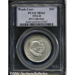 <B>1954-D<50C> Washington-Carver MS66 PCGS.</B></I> Each side presents an essentially untoned appearance with only the lightest patina visible. A small patch of charcoal color is seen over CARVER on the left side of the obverse. PCGS has certified only four examples of this commemorative production at the present grade level (3/04), a fact that confirms the importance of this lovely Gem among collectors who are assembling Registry Sets of U.S. Commemoratives.<BR><I>Ex: Santa Clara Signature Sale (Heritage, 11/01), lot 6973, which realized $2,875.</B></I><BR><I>From the JFS Collection, the #1 All-Time PCGS Registry Set.</B></I> <BR><BR><B>Important notice:</B> Heritage usually auctions material at the rate of 200-250 lots per hour. On some occasions eBay Live bid software or the Internet may not be able to keep up with the pace of the auction. We recommend placing a realistic absentee bid now as insurance to avoid disappointment. Occasionally the auctioneer may eliminate or reject an eBay Live bid, and the auctioneer may also reopen a lot after the close of the eBay live bidding (usually because we missed an audience bid), and may reject your bid even if it shows you as the winning bidder. By bidding via eBay Live, you agree that Heritage may award the lot to another bidder at its sole discretion under the circumstances described above or any other reasonable circumstances. Since eBay bids are not shown to us until we open the lot on the floor, we treat those bids just like floor bids. In most cases the floor responds before the eBay bid is presented to us, due to Internet lag time, so for consistency we have made it a policy that floor bids are always considered first over tie eBay live bids. Also please note that all Heritage lots purchased through eBay Live carry a 20% Buyer's Premium. Please make sure you read the Terms and Conditions before you bid. </span></font></tr></table></td></tr></table>