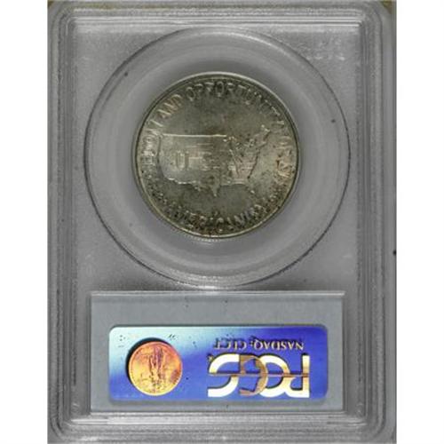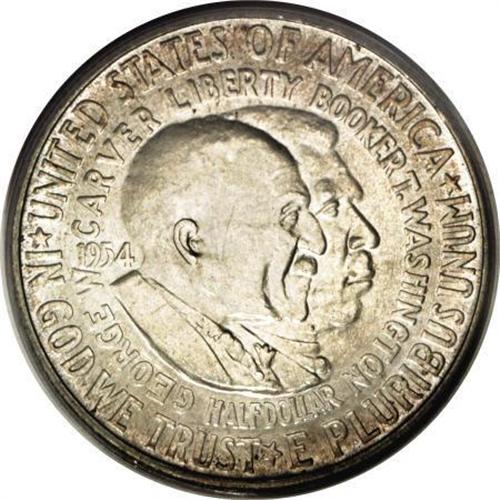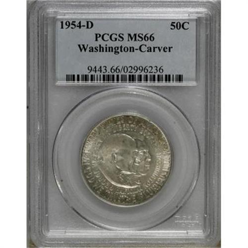 <B>1954-D 50C Washington-Carver MS66 PCGS.</B></I> Highly lustrous surfaces exhibit freckles of olive-green that are more intense on the reverse. A well executed strike brings excellent definition to the design features, and a few light ticks on the obverse and a couple of milling marks on the reverse likely prevent a higher grade. Population: 15 in 66, 0 finer (3/08).<BR><BR><b>Shipping:</b> Coins & Currency (<a target="_blank" href="http://www.heritageauctions.com/common/shipping.php">view shipping information</a>)